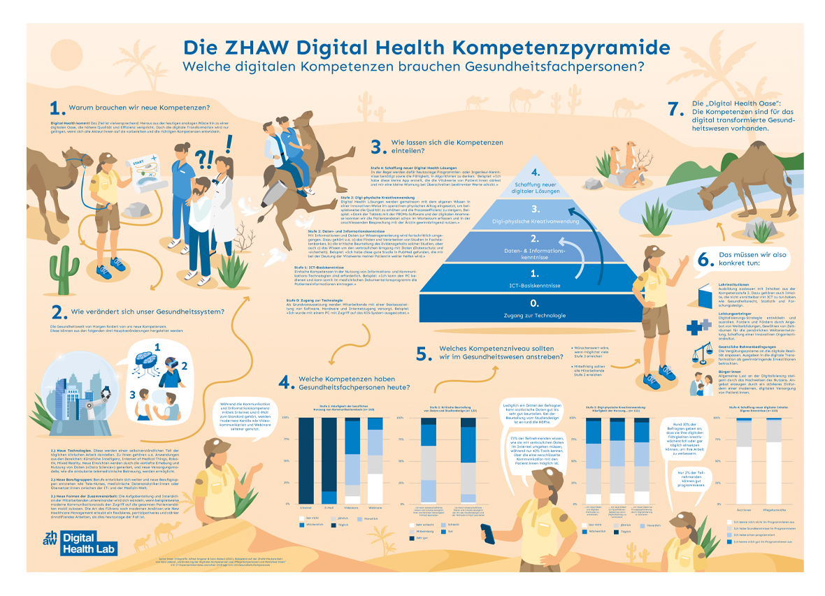 Zum Digital Health Lab Day der Zürcher Hochschule für Angewandte Wissenschaften (ZHAW) in Winterthur gestalteten wir im Auftrag von Prof. Dr. Alfred Angerer (Professor für Healthcare Management, Speaker, Autor, Consultant, Podcaster) eine Infografik zum Thema „ZHAW Digital Health Kompetenzpyramide: Welche digitalen Kompetenzen brauchen Gesundheitsfachpersonen?“.